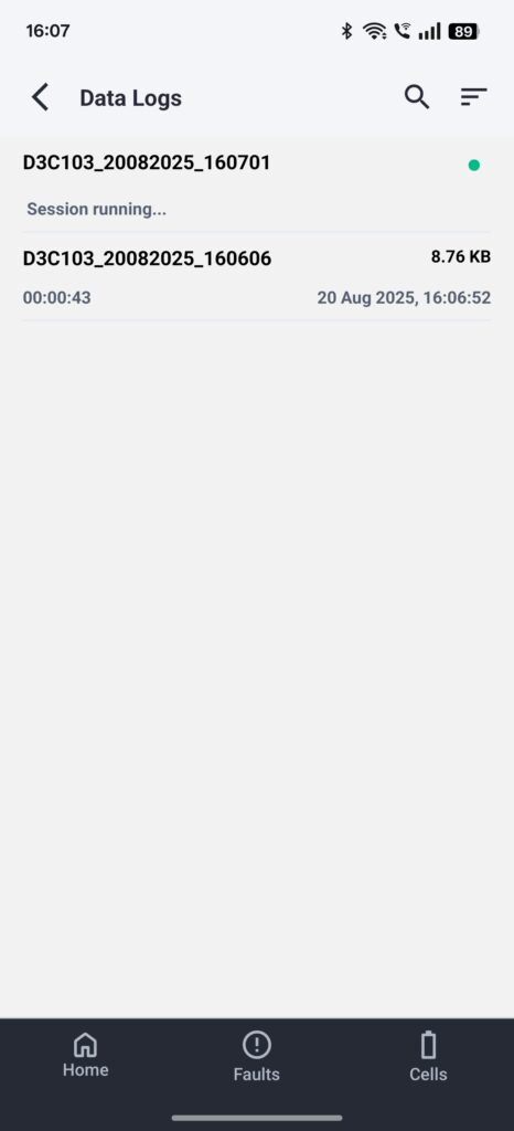 The Data Logs section of the Battery Buddy mobile app allows users to view, manage, and export historical logs captured from the connected battery system. These logs are useful for diagnostics, troubleshooting, and sharing detailed session information with technical teams.