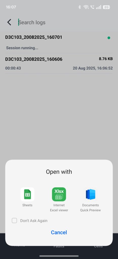 If a log file is actively being recorded, the app shows a green dot and the label “Session running” next to it. This helps users differentiate between static logs and ongoing sessions.