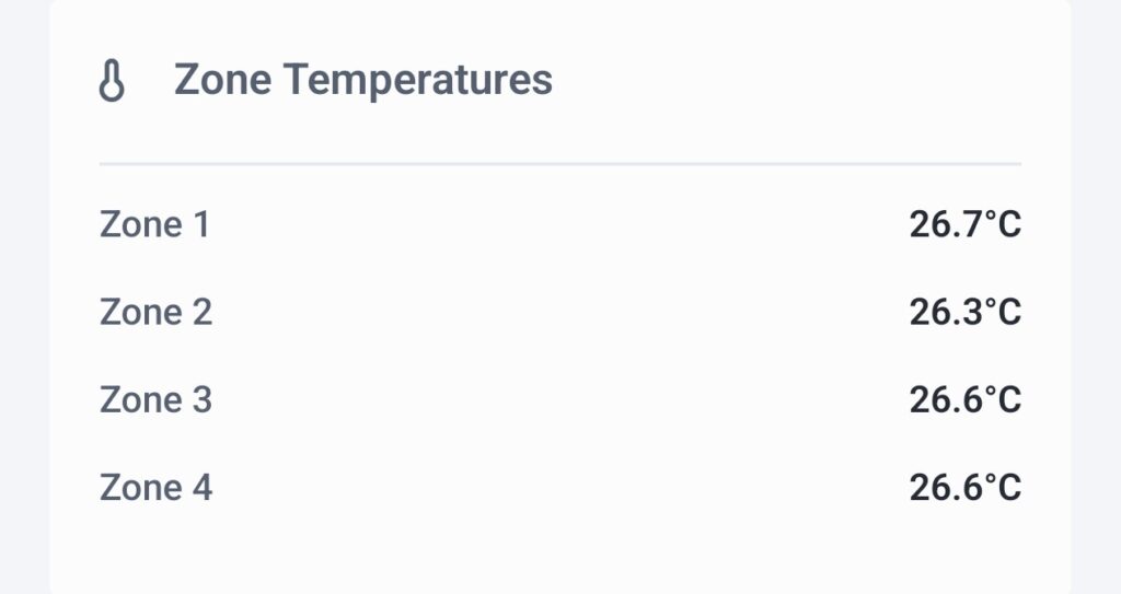 - Each Zone (e.g., Zone 1, Zone 2, Zone 3…) is shown with its respective temperature in °C.