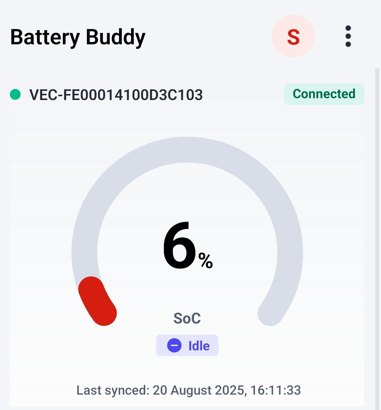 The Homepage of the Battery Buddy mobile app serves as the central hub where you can monitor your battery’s critical parameters in real time. As soon as a connection with the device is established, the homepage provides a comprehensive snapshot of the battery’s status and performance in an easy-to-read layout.