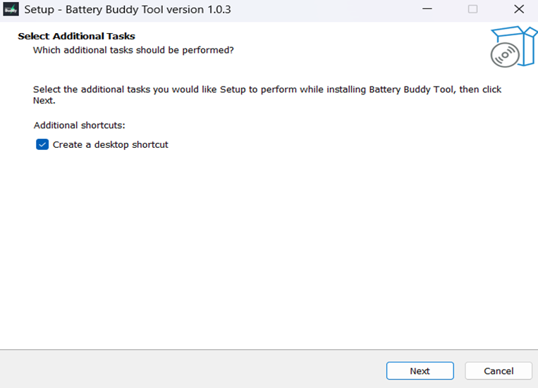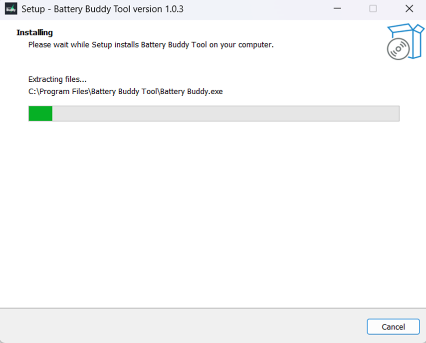 Click Install to begin the installation process. The application will be installed in the default location (usually C:\Program Files\Battery Buddy Tool) — no custom folder selection is required.