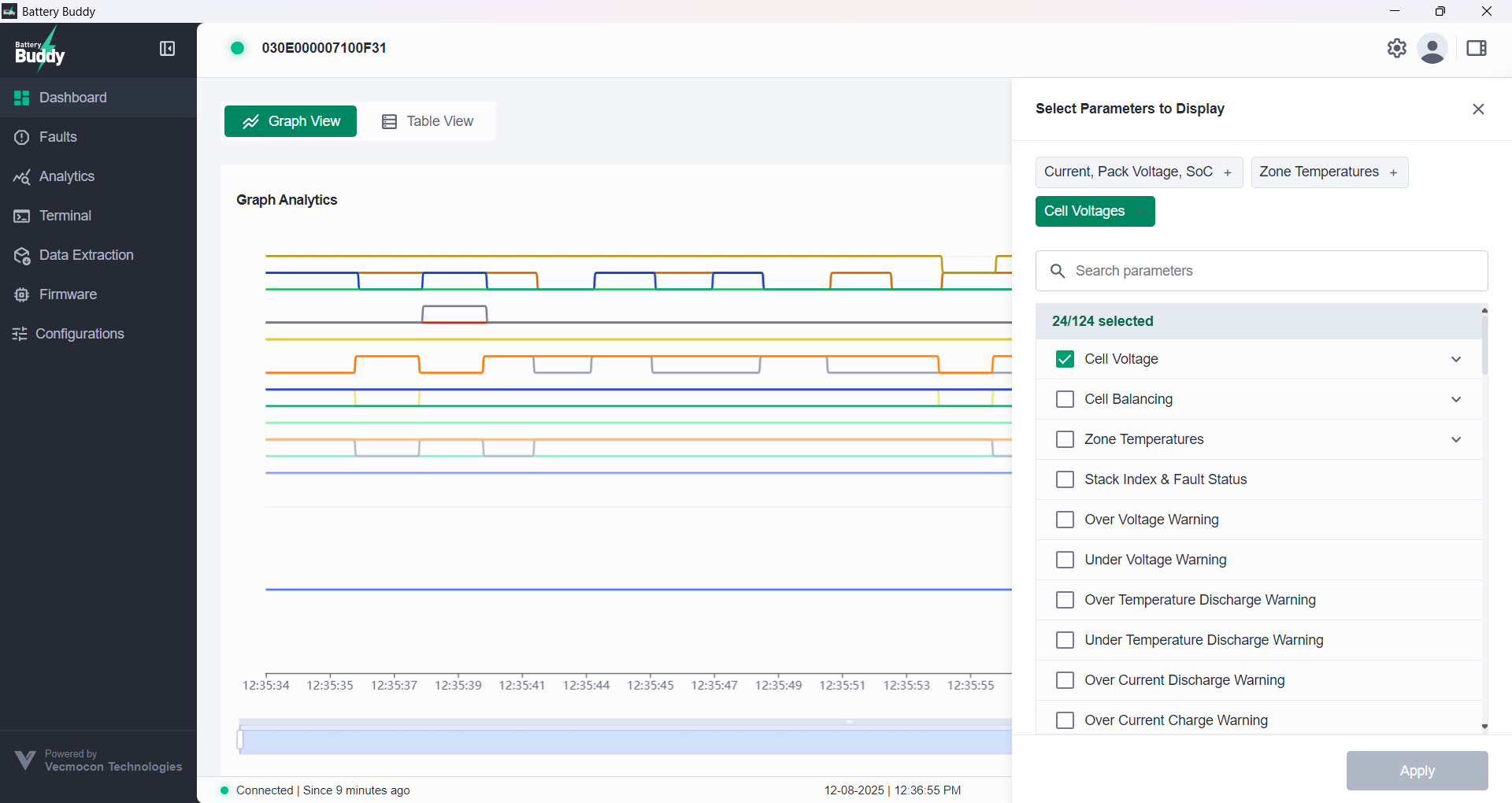 The Graph View provides a real-time, interactive line chart that plots selected battery parameters against a time axis. It allows zooming, panning, parameter selection, and live tooltips for precise insights.