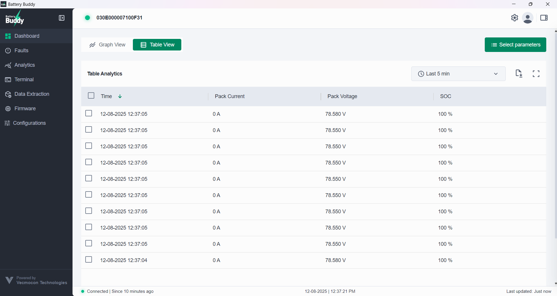 The Table View presents battery parameters in a timestamped, tabular format for detailed analysis. It allows parameter selection, time range adjustments, and exporting data to CSV for offline review.