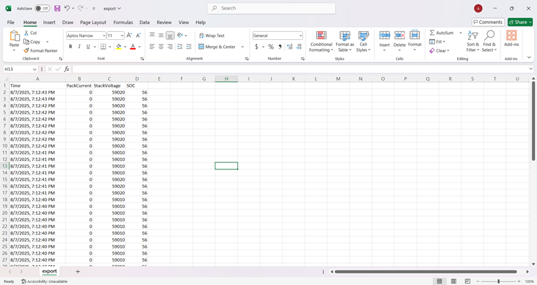 - Selected Parameters (e.g., Pack Voltage, Pack Current, SOC)