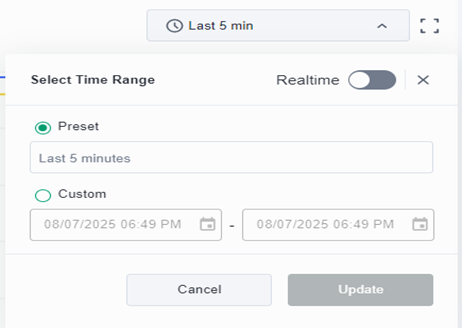 - Preset: Last 5 minutes, 30 minutes, 1 hour, etc.