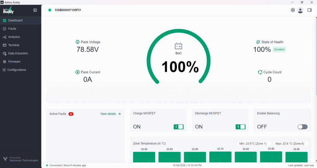 The Dashboard is the central hub of Battery Buddy where you can monitor critical battery data in real-time and control key functions of the battery system. It is designed to give you a comprehensive snapshot of system health, performance, and safety alerts — all in one place.