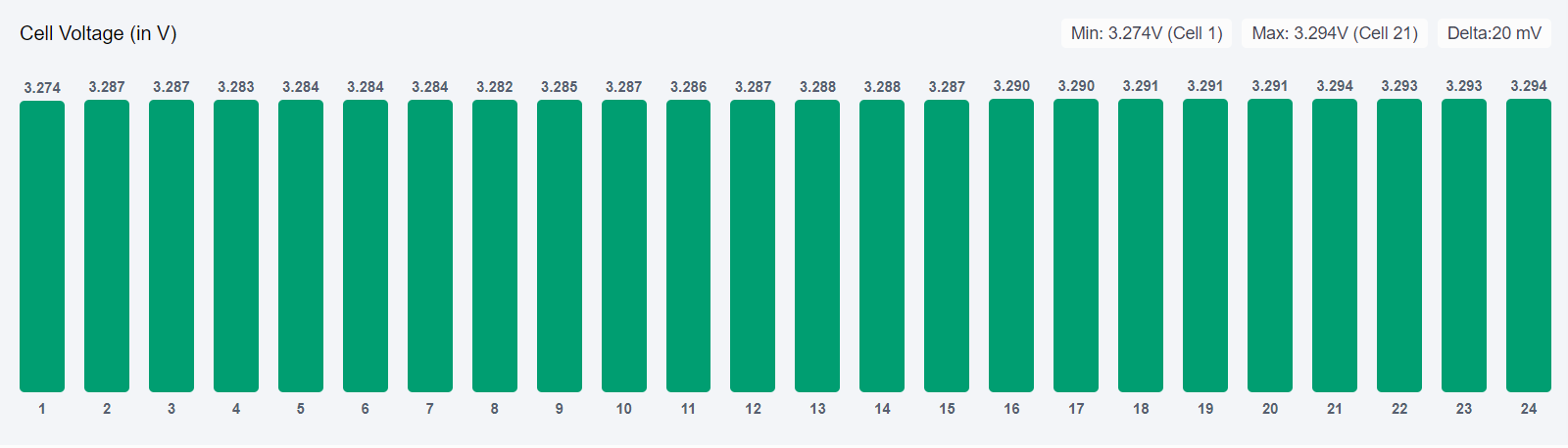 The Cell Voltage widget provides a real-time visual representation of the voltage levels of each cell in the battery pack. This helps users quickly identify imbalances, potential failures, or abnormal cell behavior — critical for battery health and safety.