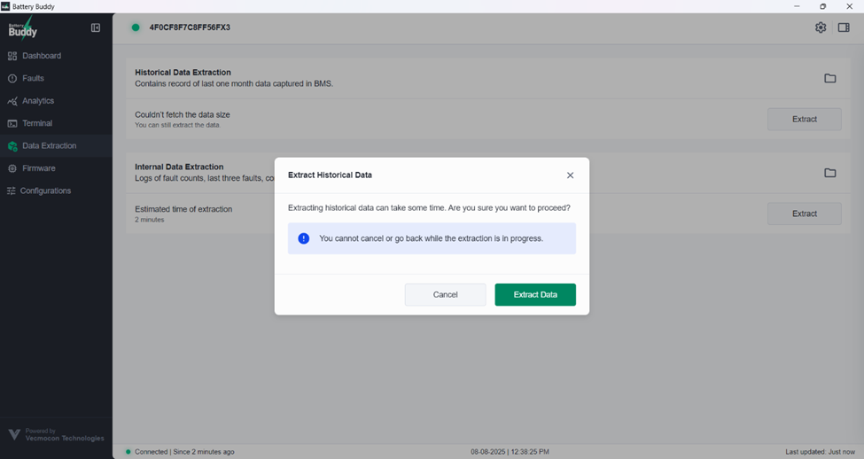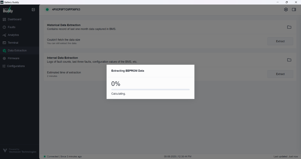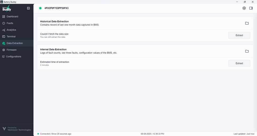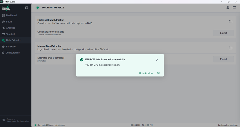 The Data Extraction module in Battery Buddy allows users to retrieve and save logs stored within the Battery Management System (BMS).
