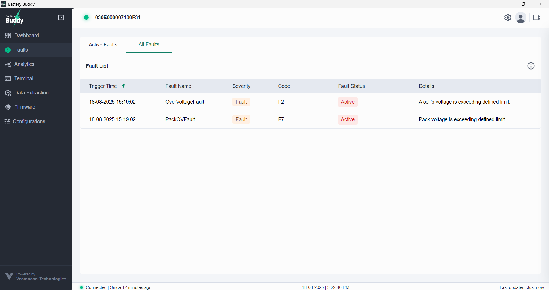 The Faults section in Battery Buddy allows users to view, manage, and analyze all fault conditions detected by the connected battery device — both current (active) and historical (session).