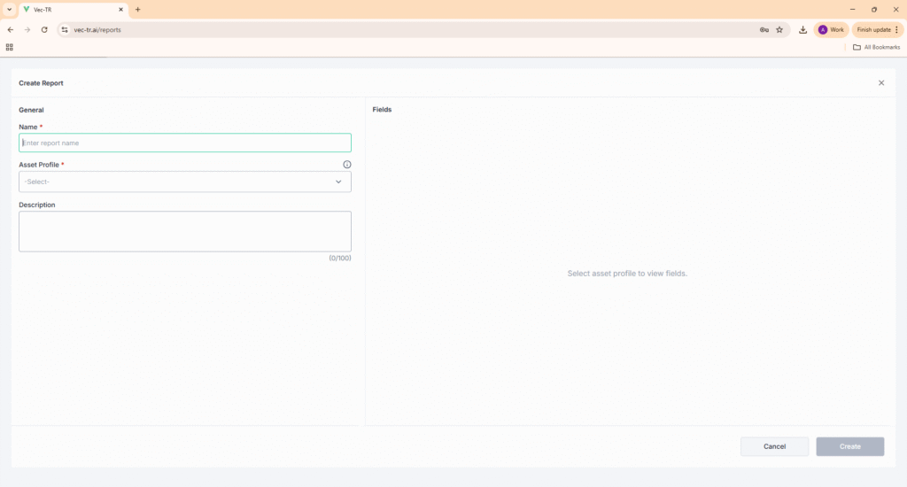 The Reports section allows you to generate customised report templates based on the available asset data. Follow the steps below to create a report:
