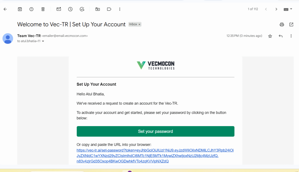 - The admin email entered during creation will receive a “Welcome to Vec-TR | Set Up Your Account” email.