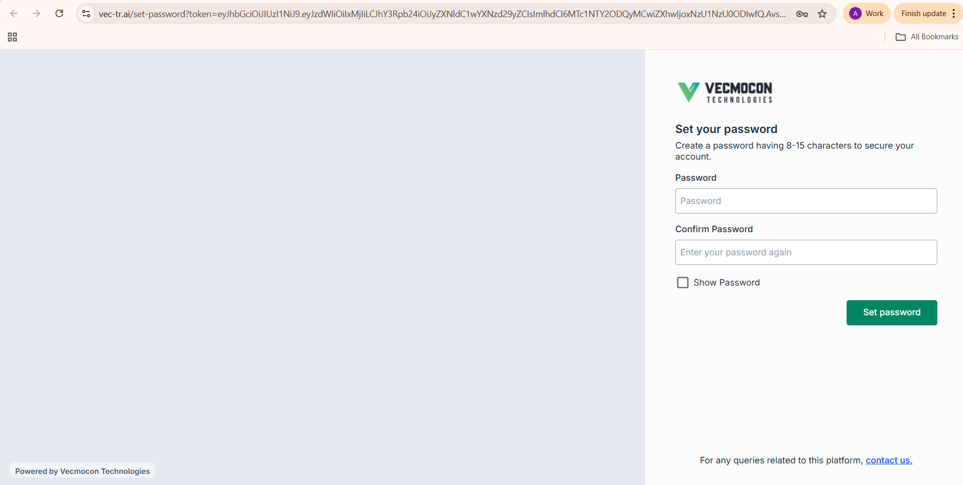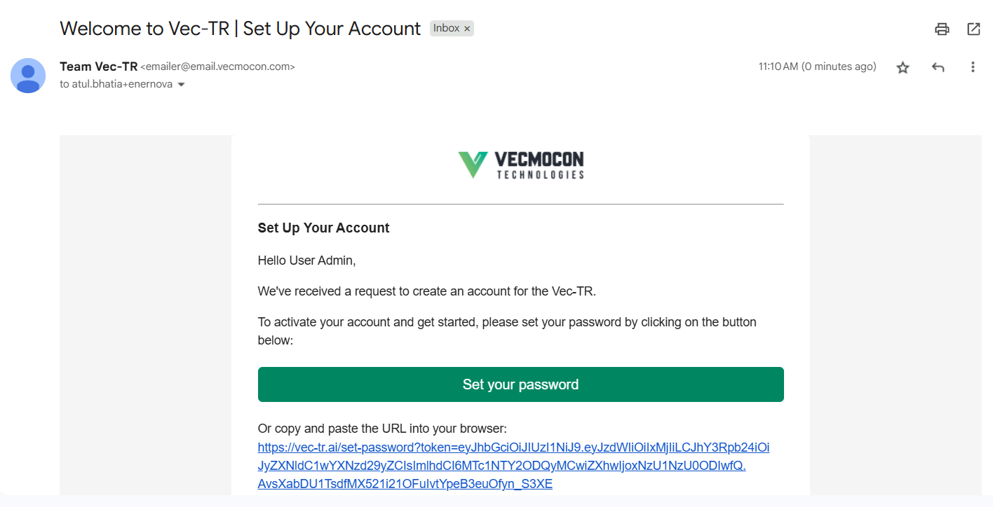 - You will receive a mail from Vec-TR with the subject line “Welcome to Vec-TR | Set Up Your Account”.