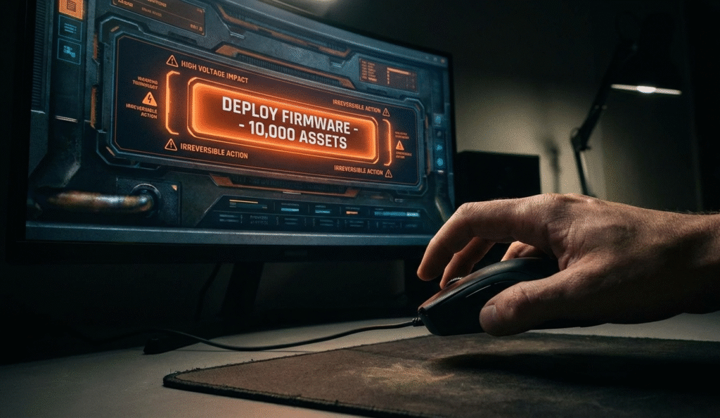 - The Commitment: A secondary confirmation screen that summarises the impact: “You are about to update 4,500 assets. Estimated downtime: 12 minutes. Continue?”